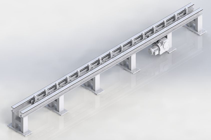 功能描述:臺架在生產(chǎn)線中用于各個(gè)工序之間,存儲和運(yùn)輸鋼管的作用。臺架上鋪設(shè)聚氨酯板或PE板(根據(jù)客戶要求,常規(guī)厚度15mm),保護(hù)鋼管除銹后外壁錨紋深度及涂覆后的PE層。由2條型鋼組成,可滿足鋼管承重要求,臺架設(shè)置一定的斜度,臺架立柱間隔2m左右。立柱同地基采用化學(xué)錨栓固定,擋管器固定于臺架上,撥管及上下管裝置放置于臺架兩側(cè)。